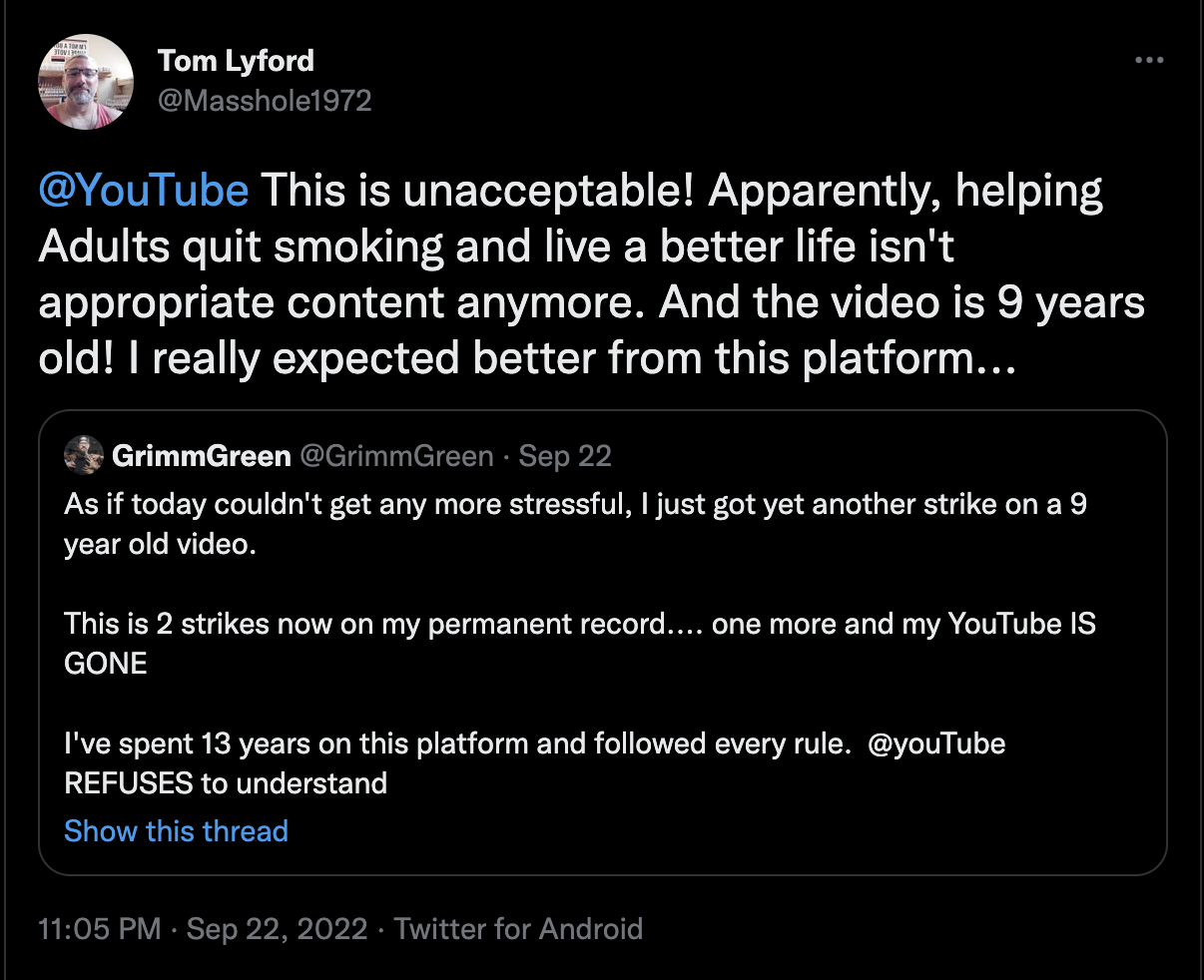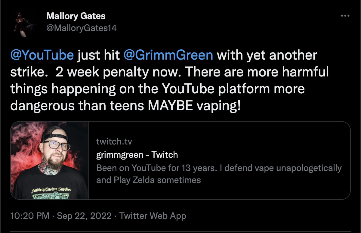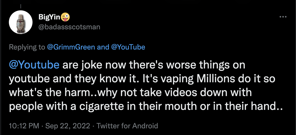 “In reality, there is a lot more questionable content that I would not want kids to have access to…so why is YouTube letting it slide while adding to the misinformation surrounding vaping and nicotine?