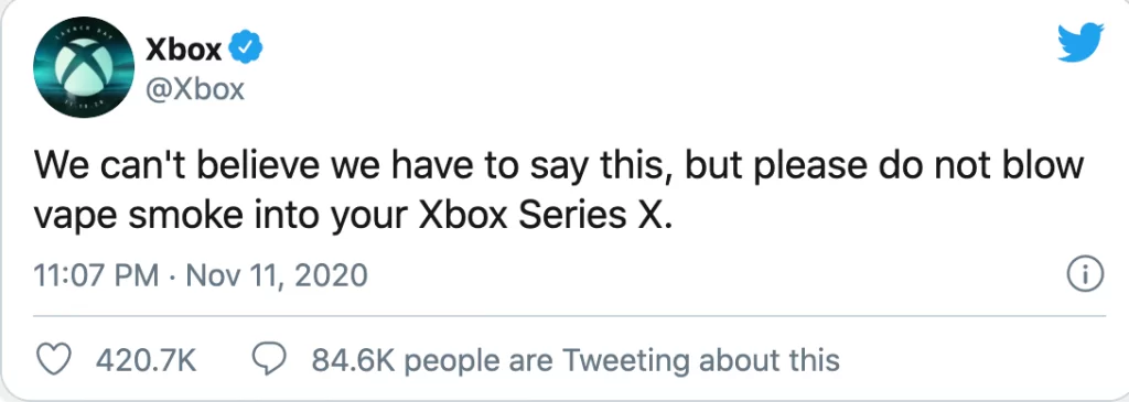 “We can’t believe we have to say this but, please do not blow vape smoke into your Xbox Series X.”