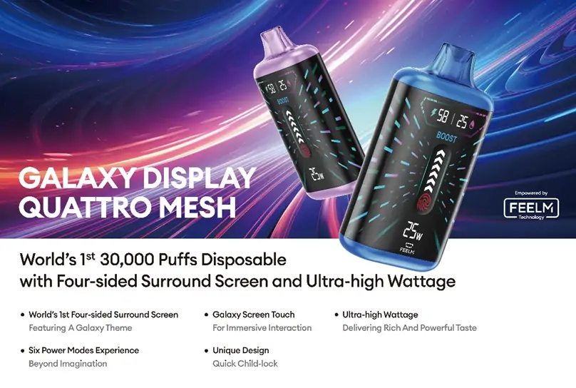 For example, the world’s first 30,000 puffs disposable with four-sided surround screen and ultra-high wattage solution “Galaxy Display + Quattro Mesh” brings a high-configuration combination of a 4.8-inch four-sided surround screen and quad mesh combined with high wattage of 40W + 6 modes of different puffs. With this device, you can experience all the cutting-edge technological innovations, instantly falling in love with it.