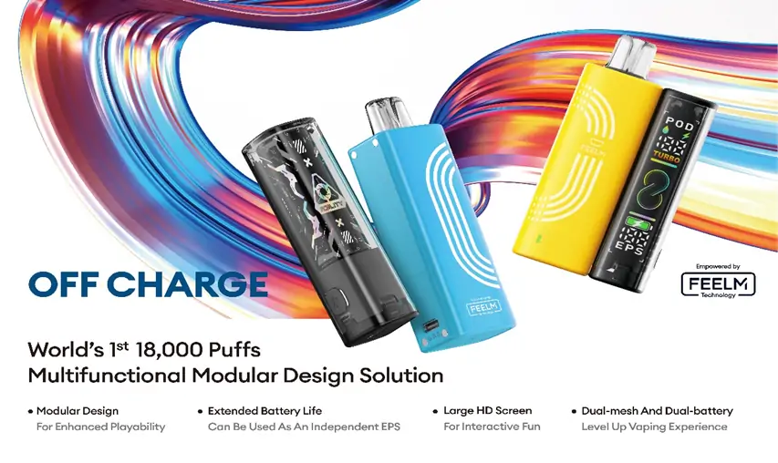 Another example is the world’s first 18,000 puffs multifunctional modular design solution “Off Charge”. It strives for ultimate playability, bringing new ideas with a modular design and adding a smart screen display. Press a button to experience different flavors. After disassembling the module, you can smoke the pod while charging your phone with the EPS, it is fun and practical.