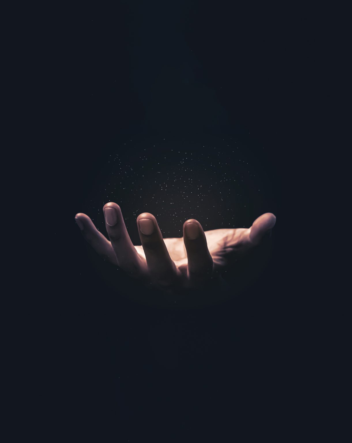 Praying hands with faith in religion and belief in God on blessing background. Power of hope or love and devotion. Magic powder floating on the magician hand